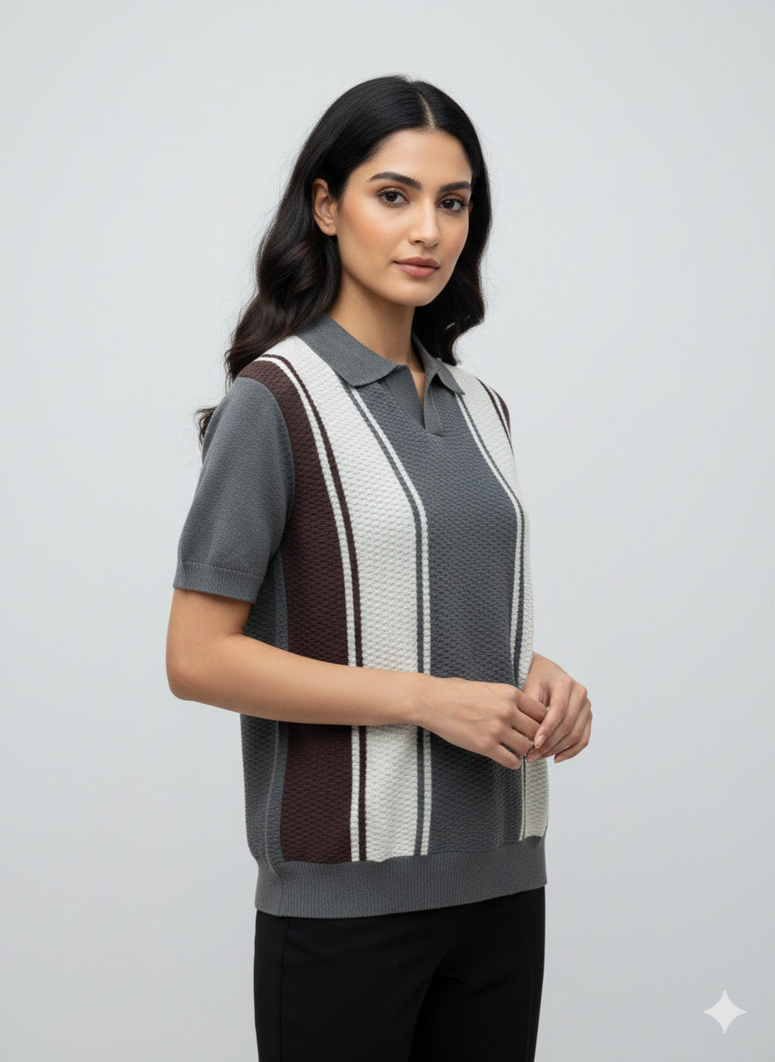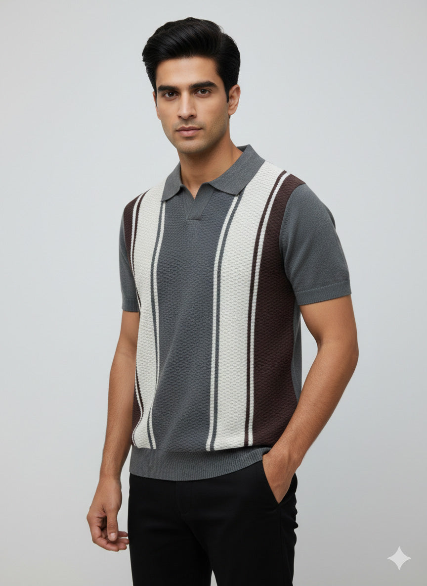 Striped Knit Polo - Gray